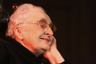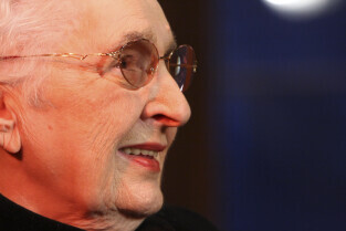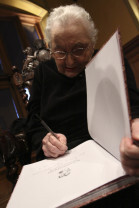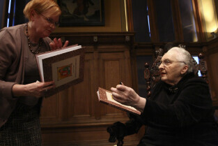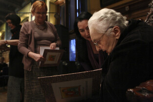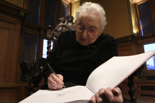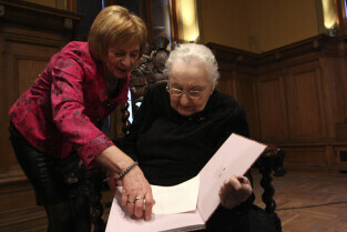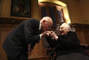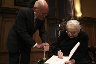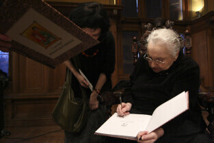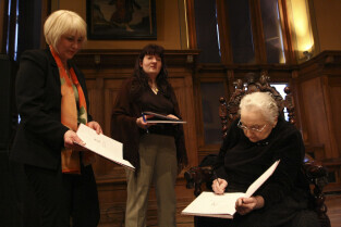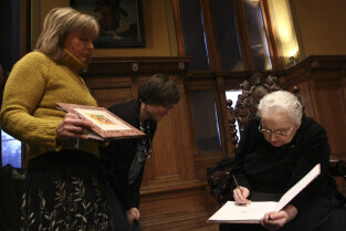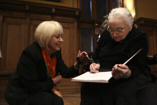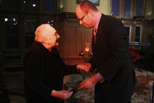 Lucyna Legut (aktorka, pisarka, malarka) w dniu swoich urodzin otrzymuje Nagrodę Kulturalną Miasta Gdańska. Gdańsk, Ratusz Staromiejski. Nz. życzenia składa Prezydent Gdańska Paweł Adamowicz