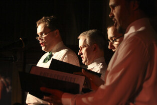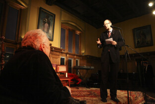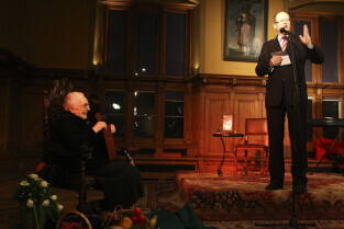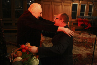 Lucyna Legut (aktorka, pisarka, malarka) w dniu swoich urodzin otrzymuje Nagrodę Kulturalną Miasta Gdańska. Gdańsk, Ratusz Staromiejski. Nz. życzenia składa Tadeusz Fiszbach
