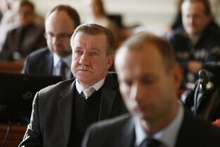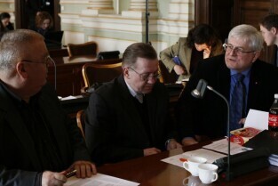 Obrady Rady Miasta Gdańska w Nowym Ratuszu. Nz. od lewej radni: Jaromir Falandysz, Kazimierz Koralewski, Wiesław Kamiński