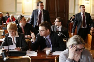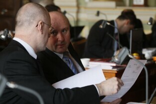 Obrady Rady Miasta Gdańska w Nowym Ratuszu. Nz. od lewej radni: Mirosław Zdanowicz, Piotr Dzik, Marek Bumblis