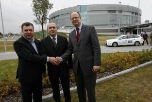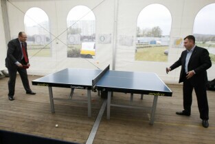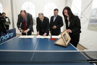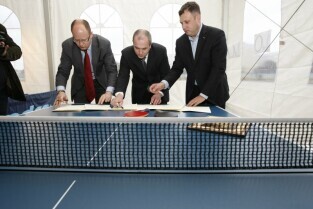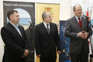 Podpisanie listu intecyjnego dotyczącego wspólnych działań Polskiego Związku Tenisa Stołowego, miast Gdańska i Sopotu na rzecz organizacji Mistrzostw Europy Tenisa Stołowego w 2011 roku. Nz. od lewej: Prezydent Gdańska Paweł Adamowicz, Prezes PZTS Andrzej Kawa, Prezydent Sopotu Jacek Karnowski