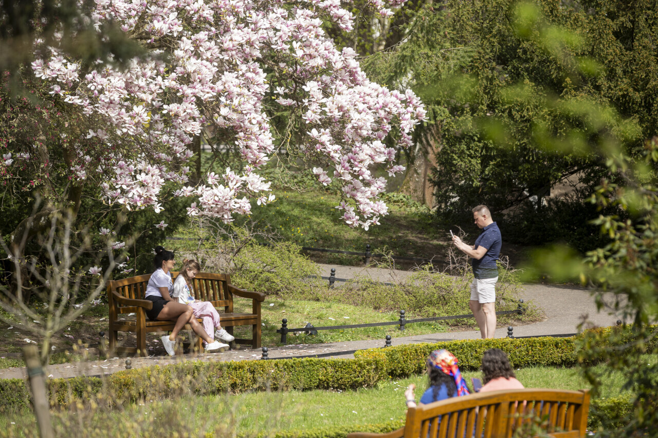 Gdańsk. Kwitnące Magnolie i tysiące innych kwiatów budzących się do życia po zimie można zobaczyć w Parku Oliwskim. Piękne widoki i letnie temperatury przyciągnęły do parku wielu mieszkańcow i turystów.