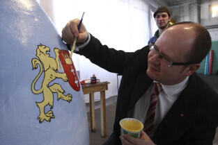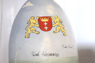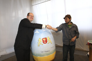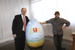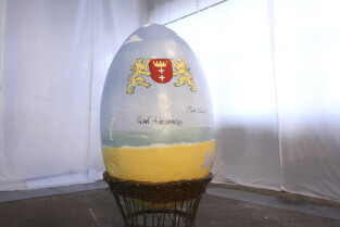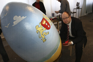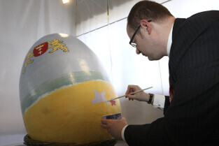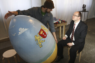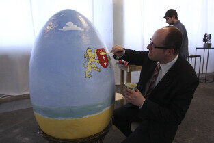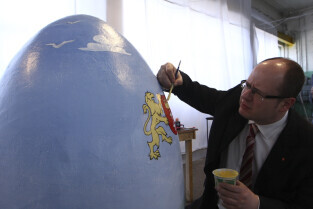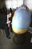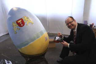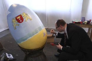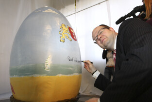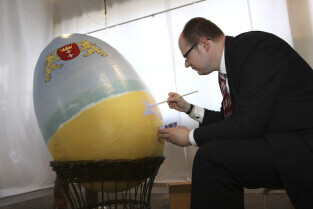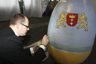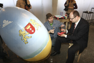 Paweł Adamowicz maluje wielkanocną pisankę, która zostanie zlicytowana na cele charytatywne. Gdańsk, Kolonia Artystów, ul. Elbląska