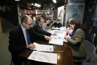 Maraton pisania listów Amnesty International w obronie praw człowieka. Gdańsk, wystawa "Drogi do Wolności". Nz. Prezydent Gdańska Paweł Adamowicz
