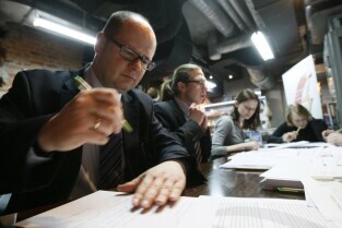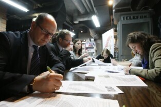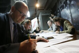 Maraton pisania listów Amnesty International w obronie praw człowieka. Gdańsk, wystawa "Drogi do Wolności". Nz. Poseł RP Paweł Orłowski