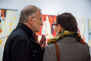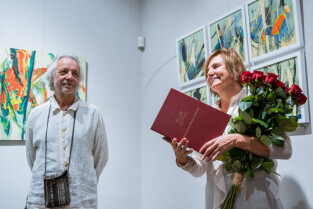 Gdańsk, ul. Korzenna. Marek Wróbel - Wystawa z okazji 35-lecia twórczości. Nz. Marek Wróbel i Ewa Rogaczewska - Referat ds. Mecenatu Kultury UMG
