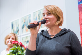 Gdańsk, ul. Korzenna. Marek Wróbel - Wystawa z okazji 35-lecia twórczości. Nz. Renata Malcer-Dymarska - Zastępca Dyrektora NCK