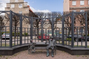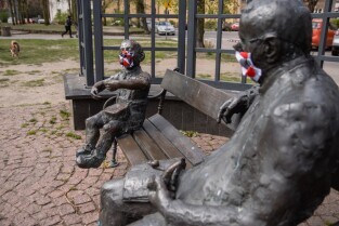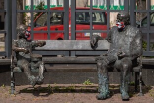 Epidemia COVID-16, od 16 kwietnia zakrywanie nosa i ust jest obowiązkowe. Solidarnie z mieszkańcami w maseczki zostały wyposażone gdańskie pomniki. Nz. Gunter Grass i Oskarek na pl. Wybickiego we Wrzeczu