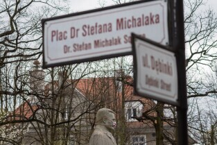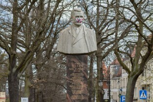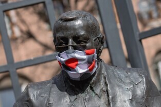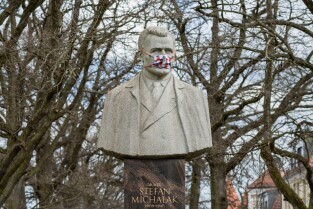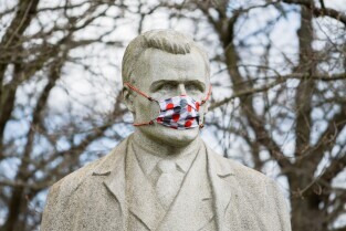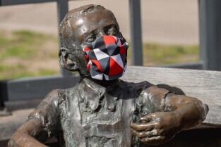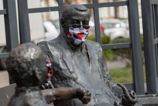 Epidemia COVID-16, od 16 kwietnia zakrywanie nosa i ust jest obowiązkowe. Solidarnie z mieszkańcami w maseczki zostały wyposażone gdańskie pomniki. Nz. Stefan Michalak, powojenny założyciel Akademii Medycznej. Pomnik stoi przy UCK