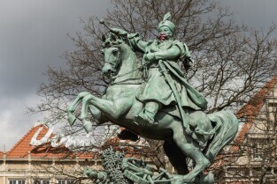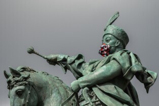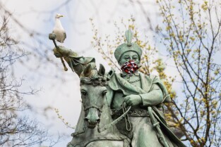 Epidemia COVID-16, od 16 kwietnia zakrywanie nosa i ust jest obowiązkowe. Solidarnie z mieszkańcami w maseczki zostały wyposażone gdańskie pomniki. Nz. Targ Drzewny, pomink Jana III Sobieskiego