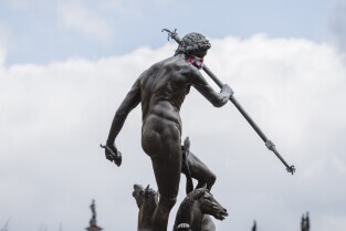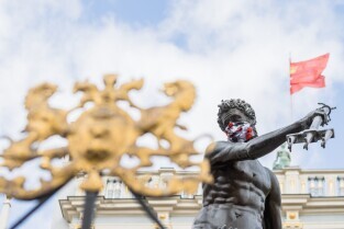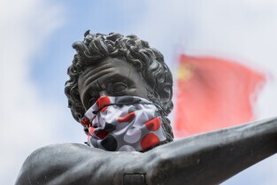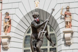 Epidemia COVID-16, od 16 kwietnia zakrywanie nosa i ust jest obowiązkowe. Solidarnie z mieszkańcami w maseczki zostały wyposażone gdańskie pomniki. Nz. Fontanna Neptuna, Długi Targ