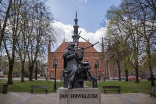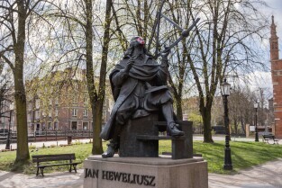 Epidemia COVID-16, od 16 kwietnia zakrywanie nosa i ust jest obowiązkowe. Solidarnie z mieszkańcami w maseczki zostały wyposażone gdańskie pomniki. Nz. Jan Haweliusz, pomnik przy Ratuszu Starego Miasta