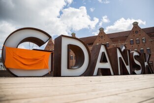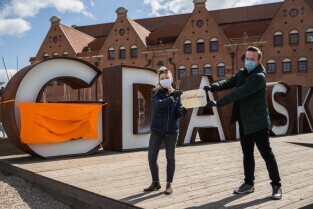 Epidemia COVID-16, od 16 kwietnia zakrywanie nosa i ust jest obowiązkowe. Solidarnie z mieszkańcami w maseczki zostały wyposażone gdańskie pomniki. Nz. napis "Gdańsk", Wyspa Ołowianka