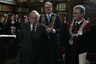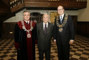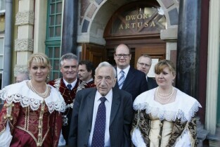 Dwór Artusa. Uroczystość nadania tytułu Honorowego Obywatela Miasta Gdańska Tadeuszowi Mazowieckiemu. Nz. od lewej: Przewodniczący Rady Miasta Gdańska Bogdan Oleszek, b. Premier RP Tadeusz Mazowiecki, Prezydent Gdańska Paweł Adamowicz