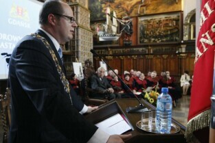 Dwór Artusa. Uroczystość nadania tytułu Honorowego Obywatela Miasta Gdańska Tadeuszowi Mazowieckiemu. Nz. Prezydent Gdańska Paweł Adamowicz