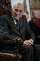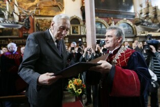 Dwór Artusa. Uroczystość nadania tytułu Honorowego Obywatela Miasta Gdańska Tadeuszowi Mazowieckiemu. Nz. od lewej: Przewodniczący Rady Miasta Gdańska Bogdan Oleszek, Tadeusz Mazowiecki, Prezydent Gdańska Paweł Adamowicz