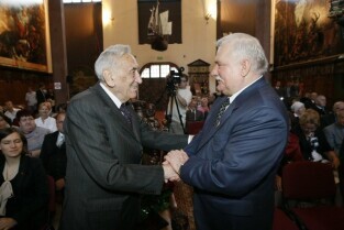 Dwór Artusa. Uroczystość nadania tytułu Honorowego Obywatela Miasta Gdańska Tadeuszowi Mazowieckiemu. Nz. z b. Prezydentem RP Lechem Wałęsą