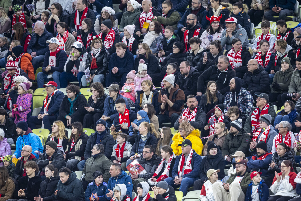 Gdańsk. Polki grały na stadionie Polsat Plus Arena z reprezentacją Holandii w meczu eliminacyjnym do Mistrzostw Świata w piłce nożnej kobiet. Nz. Kibice