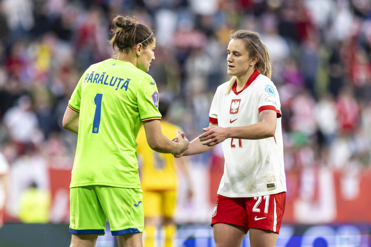 Gdańsk. Na stadionie Polsat Plus Arena odbył się mecz w piłce nożnej kobiet UEFA Woman's Nations League pomiędzy drużynami Polski i Rumunii. Nz. Po wygranym meczu Paulina Tomasiak pociesza rumuńską bramkarkę Andreea Paraluta