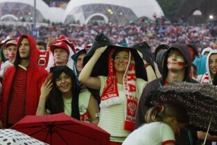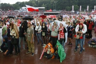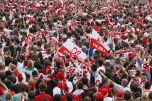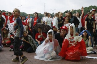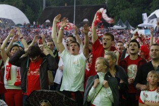 Gdańsk, Plac Zebrań Ludowych. Strefa Kibica (Fun Zone) podczas Mistrzostw UEFA Euro 2012. Mecz otwarcia Polska-Grecja, który obejrzało ponad 20 tys. kibiców. Spotkanie zakończyło się remisem 1:1.