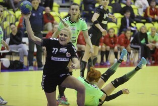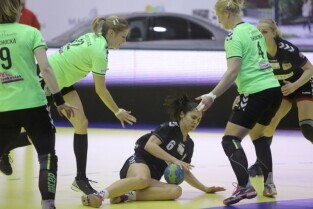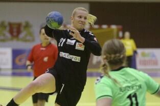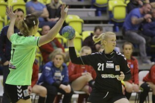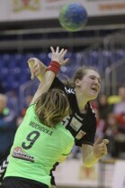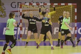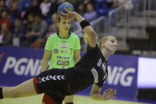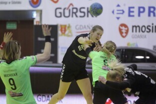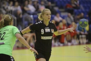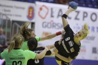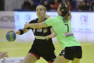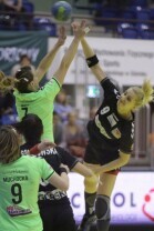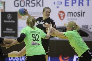 Gdańsk, Hala Widowiskowo-Sportowa AWFiS. Mecz piłkarek ręcznych AZS Łączpol AWFiS - EKS Start Elbląg. Nz Karolina Siódmiak-AZS Łączpol.