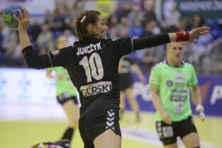 Gdańsk, Hala Widowiskowo-Sportowa AWFiS. Mecz piłkarek ręcznych AZS Łączpol AWFiS - EKS Start Elbląg. Nz Małgorzata Jurczyk-AZS Łączpol.
