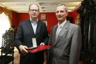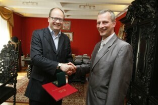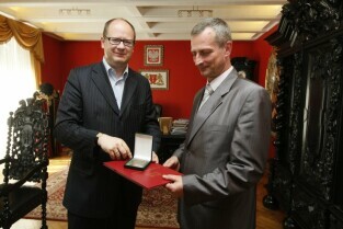 Prezydent Gdańska Paweł Adamowicz wręcza Medal Prezydenta Gdańska Panu Waldemarowi Kowalskiemu, byłemu wicedyrektorowi Aresztu śledczego w Gdańsku, za zasługi w promocji dziejów Gdańska