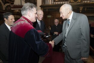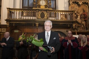 Gdańsk, Dwór Artusa. Uroczysta sesja Rady Miasta Gdańska, podczas której wręczono Medale Św. Wojciecha i Księcia Mściwoja II. Nz. laureat Medul Św. Wojciecha Prof. Edmund Wittbrodt