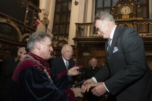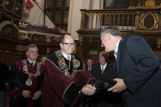 Gdańsk, Dwór Artusa. Uroczysta sesja Rady Miasta Gdańska, podczas której wręczono Medale Św. Wojciecha i Księcia Mściwoja II. Nz. laureat Medalu Księcia Mściwoja Prof. Waldemar Tłokiński, wyróżnienie wręcza Przewodniczący Rady Miasta Gdańska Bogdan Oleszek