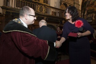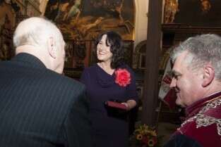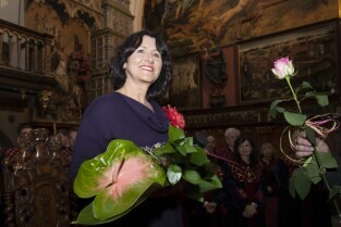 Gdańsk, Dwór Artusa. Uroczysta sesja Rady Miasta Gdańska, podczas której wręczono Medale Św. Wojciecha i Księcia Mściwoja II. Nz. laureatka Medalu Księcia Mściwoja