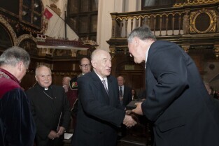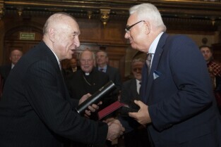 Gdańsk, Dwór Artusa. Uroczysta sesja Rady Miasta Gdańska, podczas której wręczono Medale Św. Wojciecha i Księcia Mściwoja II. Nz. laureat Medalu Księcia Mściwoja Jan Szomburg, gratulacje składa Abp Senior Tadeusz Gocłowski