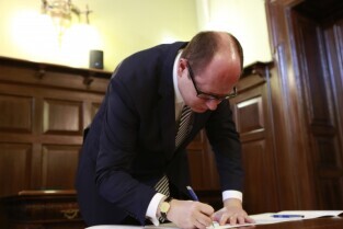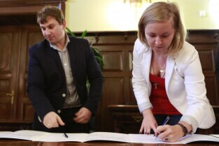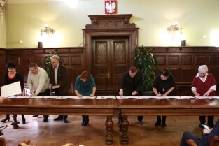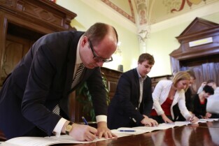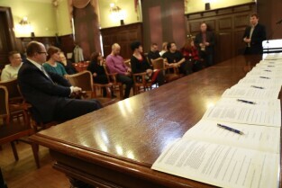 Gdańsk, Nowy Ratusz. Podpisanie Porozumienia dotyczącego budowy gdańskiego modułu „Metropolitalnego Systemu Aktywizacji Społeczno-Zawodowej”. Dokument podpisali prezydent Gdańska Paweł Adamowicz oraz przedstawiciele 11 organizacji pozarządowych.