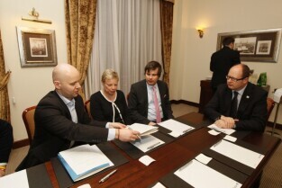 Podpisanie umowy pomiędzy fińską firmą Metsä Group i Gdańską Agencją Rozwoju Gospodarczego (investGda), na mocy której Miasto Gdańsk udzieli wsparcia przy otwarciu biura w Gdańsku. Nz. od lewej: Prezes InvestGDA Alan Aleksandrowicz, Anneli Karhula, Director of Human Resources at Metsä Group, Jussi Noponen, SVP, Group Controller at Metsä Group, Prezydent Gdańska Paweł Adamowicz