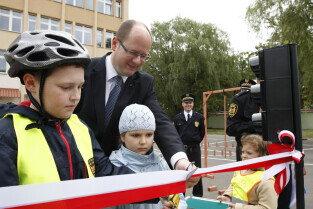 Otwarcie miasteczka ruchu drogowego przy Zespole Szkół Samochodowych w Gdańsku. Nz. Paweł Adamowicz, Prezydent Gdańska, wraz z grupą dzieci, uroczyście przecina wstęgę.