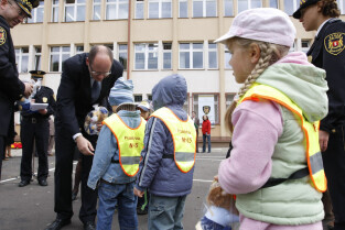 Otwarcie miasteczka ruchu drogowego przy Zespole Szkół Samochodowych w Gdańsku. Nz. Paweł Adamowicz, Prezydent Gdańska, rozdaje dzieciom Lwika - maskotkę Straży Miejskiej w Gdańsku.