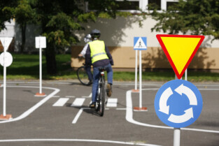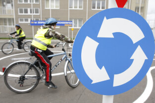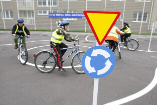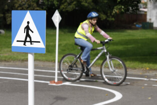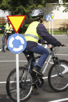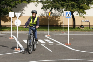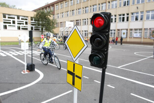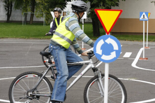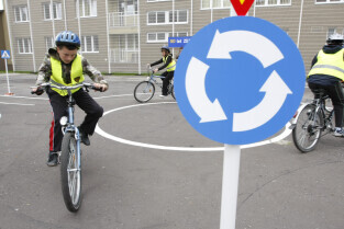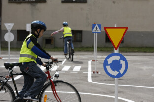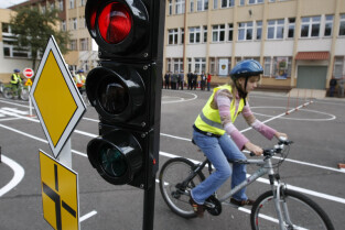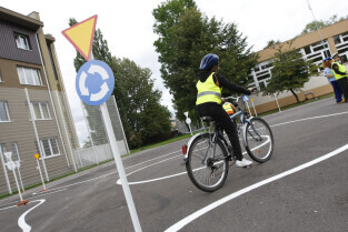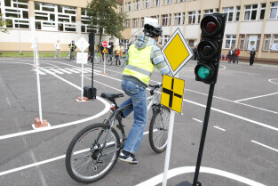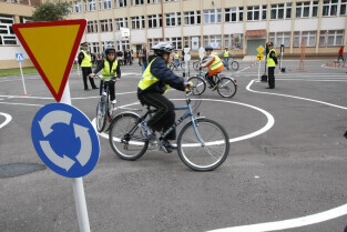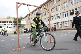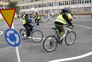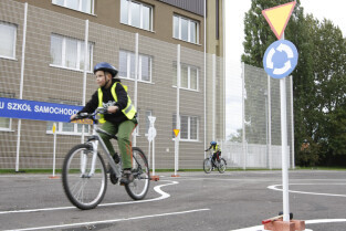 Otwarcie miasteczka ruchu drogowego przy Zespole Szkół Samochodowych w Gdańsku. Nz. uczniowie Szkoły Podstawowej nr 65 na rowerach.