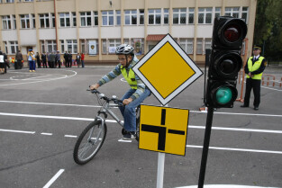 Otwarcie miasteczka ruchu drogowego przy Zespole Szkół Samochodowych w Gdańsku. Nz. funkcjonariusz Straży Miejskiej w Gdańsku.