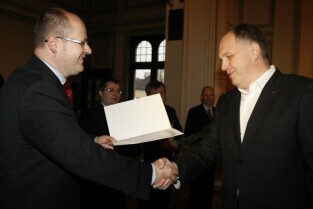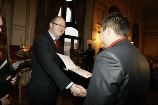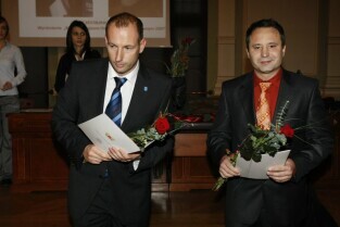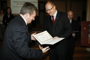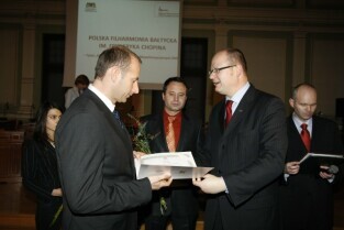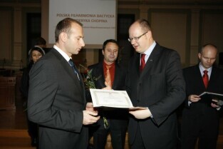 Wręczenie nagród laureatom IV edycji konkursu "Miejsce Przyjazne Osobom Niepełnosprawnym 2009". Nz. przedstawiciele zwycięzców konkursu, od lewej: Dariusz Futoma (Hotel Scandic Gdańsk), Błażej Słowikowski (Lechia Gdańsk), Roman Perucki (Polska Filharmonia Bałtycka)