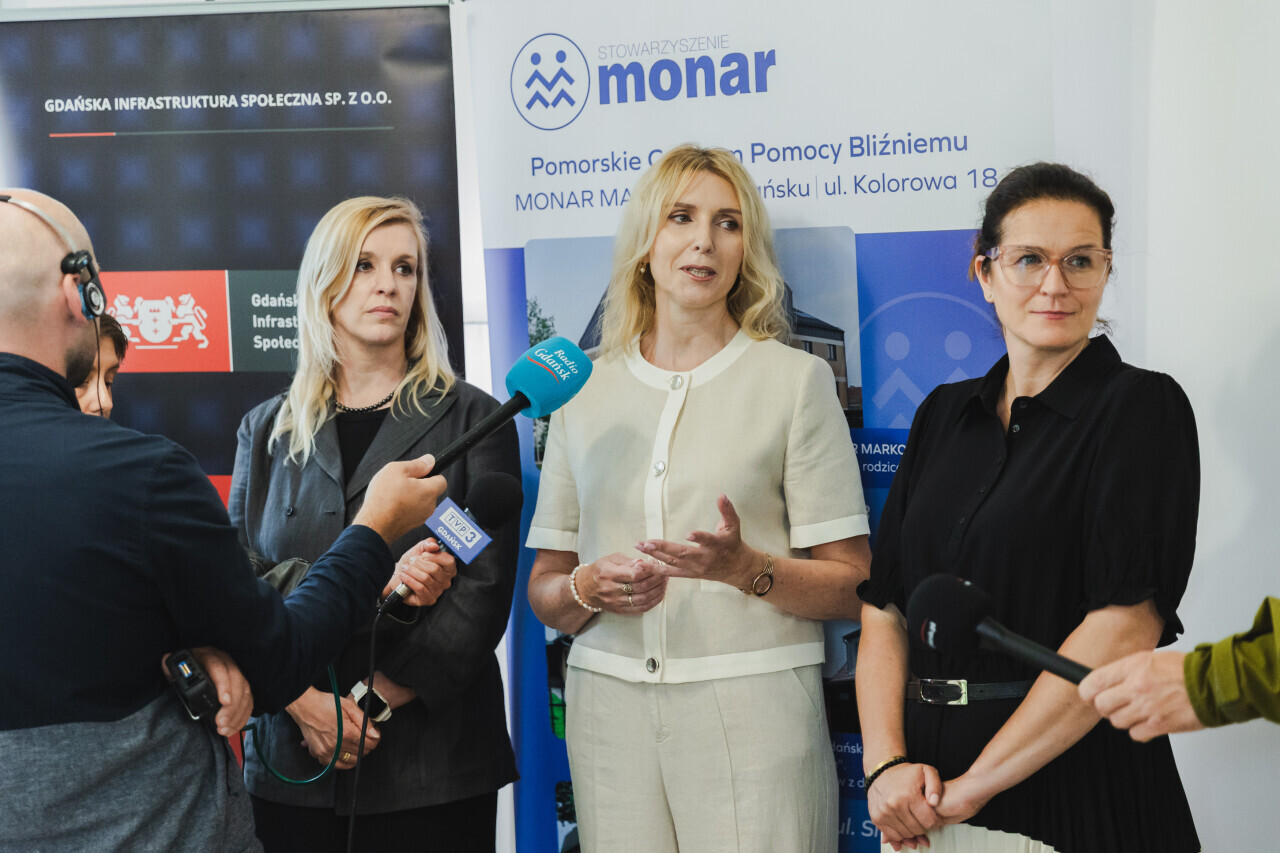 Gdańsk. Mieszkania treningowe przy ulicy Kolorowej oddano do użytku. Mieszkania treningowe ze wsparciem. W wydarzeniu brali udział, Aleksandra Dulkiewicz, prezydent Gdańska, Emilia Lodzińska, zastępczyni prezydenta ds. rozwoju przestrzennego i mieszkalnictwa, Aleksandra Krzywosz, prezes Gdańskiej Infrastruktury Społecznej, Agnieszka Nowak – dyrektor Pomorskiego Centrum Pomocy Bliźniemu MONAR-MARKOT, Elżbieta Zielińska, przewodnicząca Stowarzyszenia MONAR
