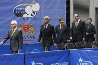 Gdańsk, Ergo Arena. Mistrzostwa Europy 2011 w Tenisie Stołowym. Nz. od lewej: Przewodniczący Komitetu Organizacyjnego Mistrzostw Europy Ryszard Weisbrodt, Prezes Europejskiego Związku Tenisa Stołowego Srefano Bossi, Minister Sportu i Turystyki Adam Giersz, Prezydent Gdańska Paweł Adamowicz, Prezydent Sopotu Jacek Karnowski