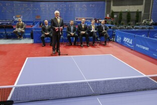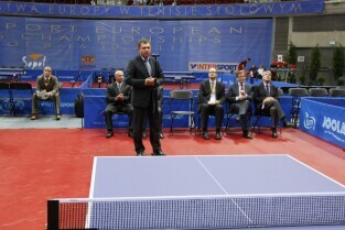 Gdańsk, Ergo Arena. Mistrzostwa Europy 2011 w Tenisie Stołowym. Nz. przemawia Prezes Europejskiego Związku Tenisa Stołowego Srefano Bossi