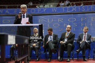 Gdańsk, Ergo Arena. Mistrzostwa Europy 2011 w Tenisie Stołowym. Nz. od prawej: Prezes Europejskiego Związku Tenisa Stołowego Srefano Bossi, Minister Sportu i Turystyki Adam Giersz, Prezydent Gdańska Paweł Adamowicz, Prezydent Sopotu Jacek Karnowski, Przewodniczący Komitetu Organizacyjnego Mistrzostw Europy Ryszard Weisbrodt