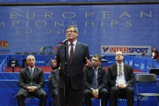 Gdańsk, Ergo Arena. Mistrzostwa Europy 2011 w Tenisie Stołowym. Nz. przemawia Prezydent Gdańska Paweł Adamowicz