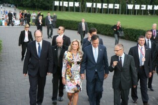 Podczas wizyty w Gdańsku kandydat Partii Republikańskiej na prezydenta Stanów Zjednoczonych Mitt Romney złożył kwiaty pod Pomnikiem Obrońców Wybrzeża na Westerplatte. Nz. Miit Romney, Paweł Machcewicz - dyrektor Muzeum II Wojny Światowej.