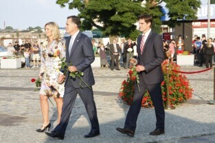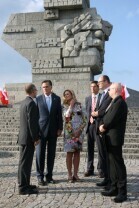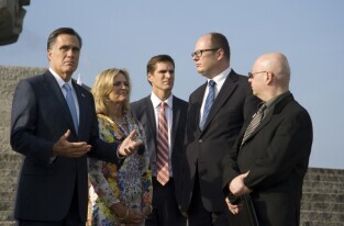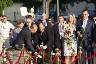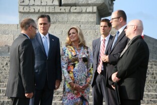 Podczas wizyty w Gdańsku kandydat Partii Republikańskiej na prezydenta Stanów Zjednoczonych Mitt Romney złożył kwiaty pod Pomnikiem Obrońców Wybrzeża na Westerplatte. Nz. Mitt Romney z żoną Ann i synem Joshem.