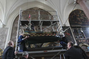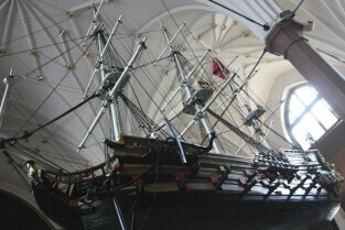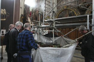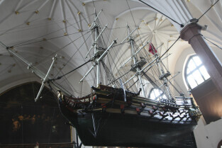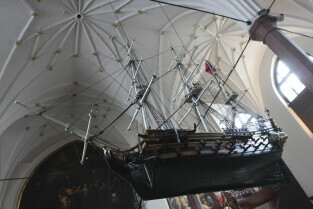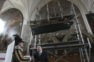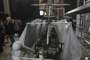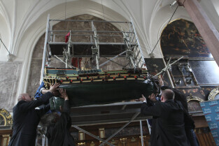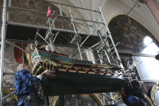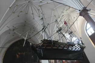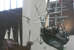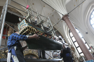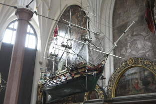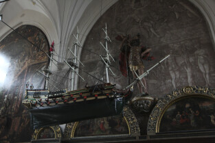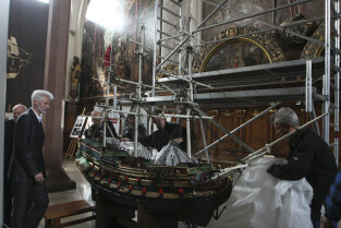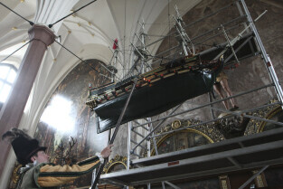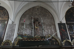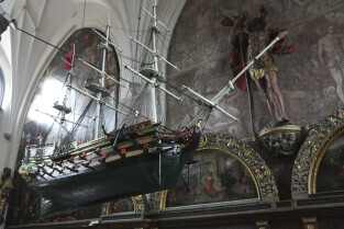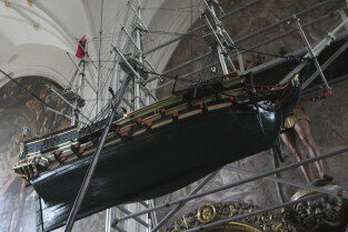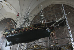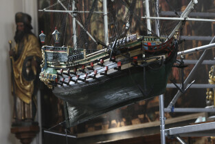 Zabytkowy model galeonu "St. Jacob" z XVII w., który zawisł w Dworze Artusa w Gdańsku. W tle figura Św. Jakuba