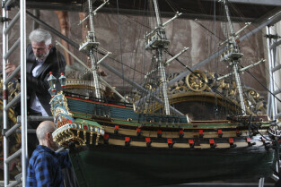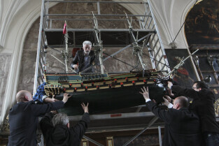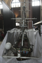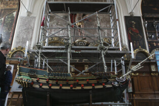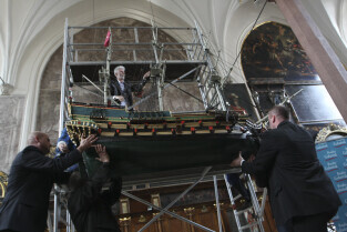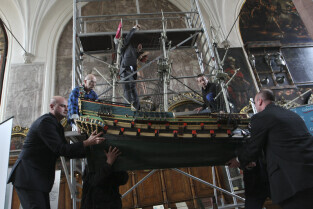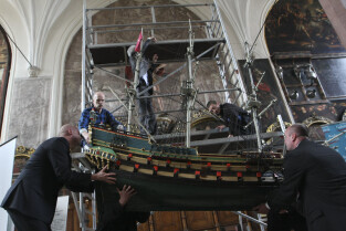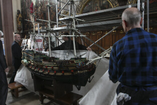 Zabytkowy model galeonu "St. Jacob" z XVII w., który zawisł w Dworze Artusa w Gdańsku