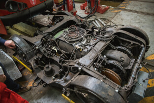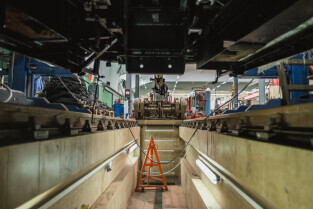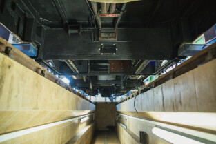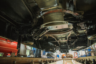 “Dortmundy” ustawiane są na kanałach naprawczych w zajezdni. Na pierwszym planie zdemontowany wózek napędowy