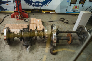 Nowe koła i zregenerowane przekładnie przed montażem w wózku