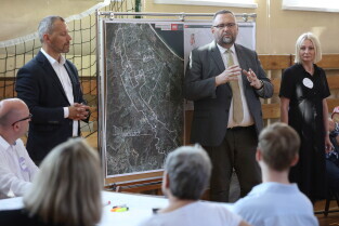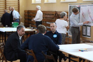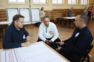 Gdańsk. Moderowane warsztaty dla mieszkańców. Uczestnicy odpowiadali m.in. na pytanie: jakie zmiany obserwujemy obecnie w okolicy alei Grunwaldzkiej? Nz. Przemysław Kluz, Gdańska Fundacja Innowacji Społecznej, Prof. Piotr Lorens Architekt Miasta Gdańska i Dyrektor Biura Rozwoju Gdańska Edyta Damszel-Turek.